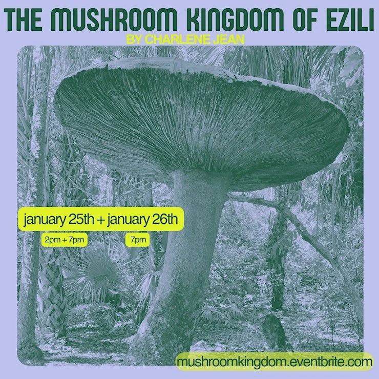 The Mushroom Kingdom of Ezili is a bold musical project created by Charlene Jean, where we reimagine Black, Queer, and Femme joy in an ecologically vibrant, pleasure-centered world. The story follows the Mud People—a polyamorous family born of the Mushroom land—who live in harmony under Queen Milfie’s guidance. When George, a struggling artist, forages mushrooms to overcome his creative block, he traps the Mud People within his imagination, reshaping their loving community into a constrained, monogamous nightmare. Over time, the two femmes in the polycule rediscover their love, transforming George’s mind from a prison into a spring of life, and Milfie brings him into the Kingdom, where he becomes part of the ecosystem he once exploited.