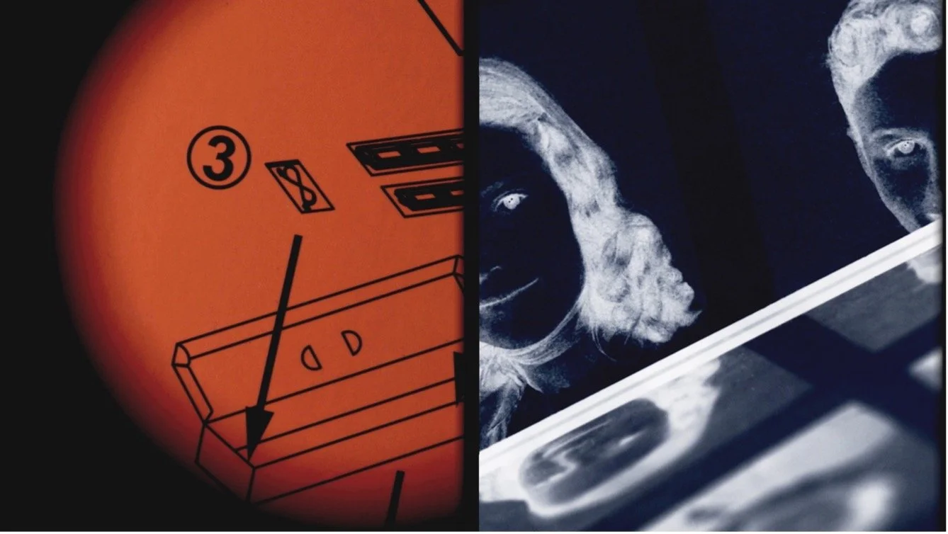 These found photographs, which place the students in unforgiving grids, suggest a desire for an orderly world where such instructions might actually be followed. As the three-channel installation progresses, the images move forward in time and become more complex and harder to grasp. The photographs become their own kind of diagrams, forming barely glimpsed guides to the students’ near/future world--- the 1960’s--- when the imagined order of things will, in fact, be exploded.