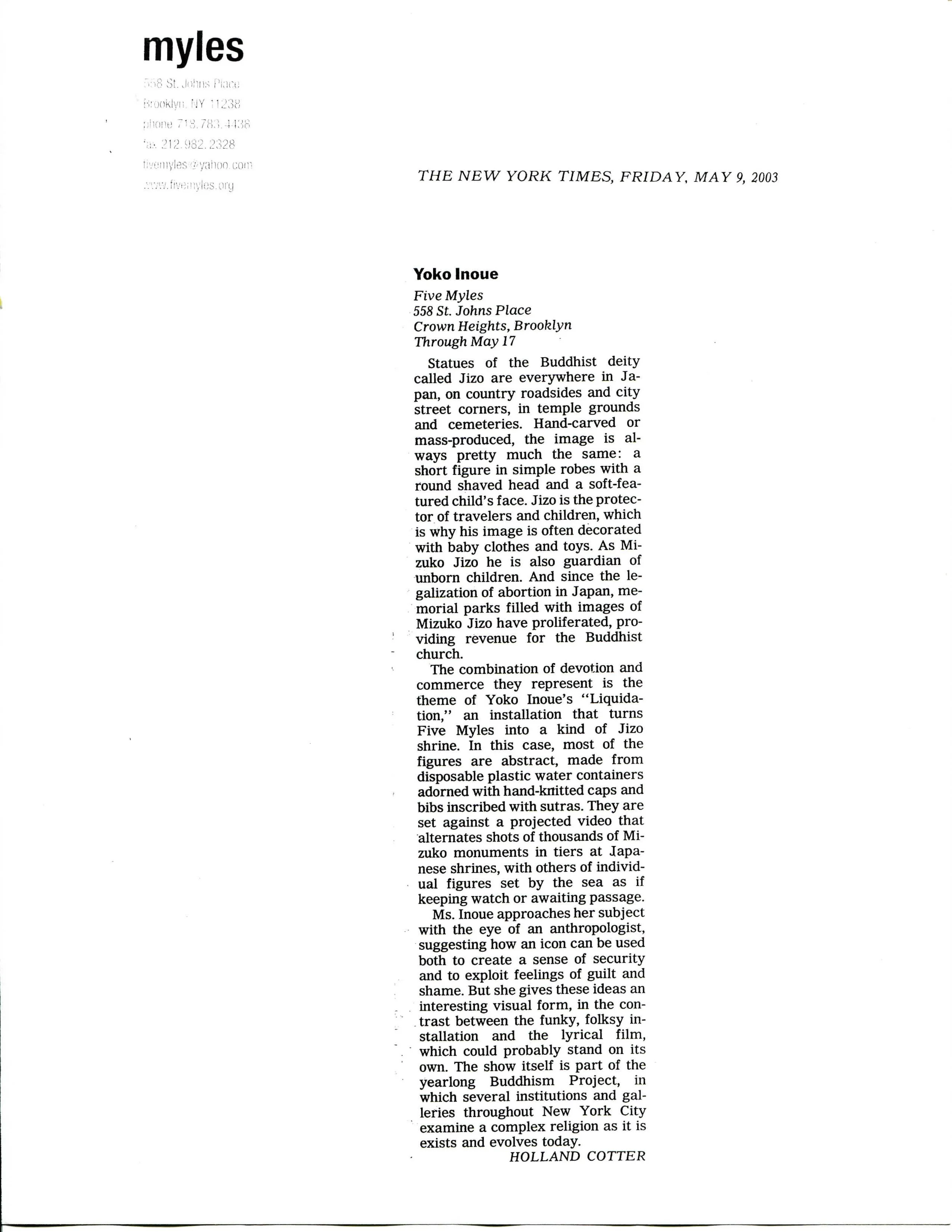 Yoko Inoue’s sculptures and installations have been shown in New York at GreeneNaftali Gallery, The Bronx Museum of the Arts, Art in General, Sculpture Center, Long Island University, Brooklyn Public Library, Lower Manhattan Cultural Council, Socrates Sculpture Park, among other venues. She has had solo exhibitions at Flipside Gallery in Brooklyn and Von Lintel Gallery in New York.This exhibitionhas been generously supported by Marty Markowitz, Borough President of Brooklyn. As another part of THE BUDDHISM PROJECT five myles is organizing Meditation for the Hand at Salena Gallery at Long Island University-Brooklyn Campus. This exhibition of work that has been developed through meditative absorption will run from August 11 - October 11, 2003.