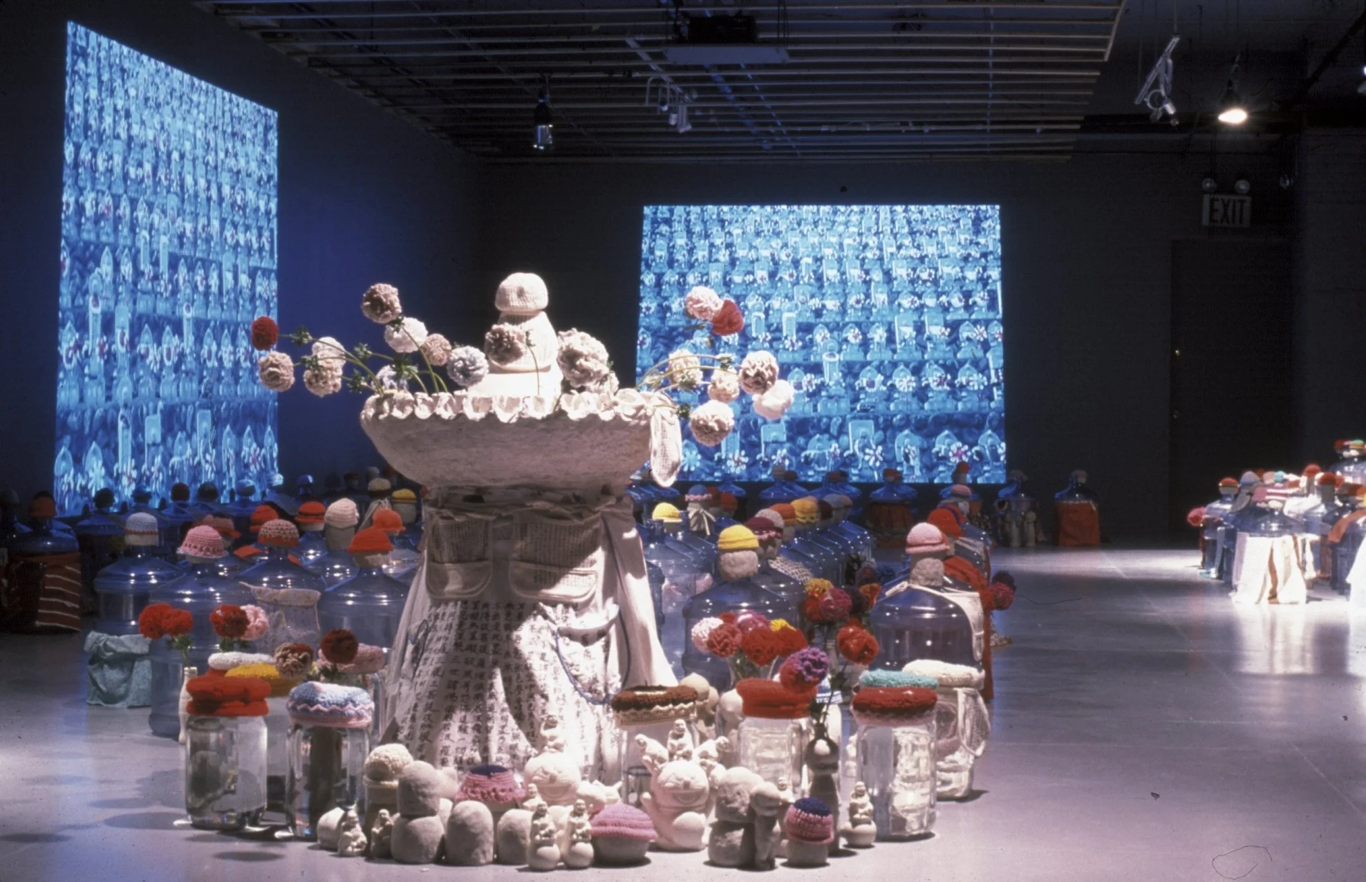 In this exhibition, two video projections will immerse the viewer in the tension between the spiritual and the commercial aspects of Mizuko Jizo worship. Rows of large, empty bottled-water containers, adorned with knitted caps, inscribed bibs, aprons and cast ceramic objects, will fill the gallery and offer a parallel version of the ritual as well as an understanding of the spiritual needs that evolved Mizuko Jizo worship. This installation gives full range to Yoko Inoue’s concern with “the interface of commodity and spirit” (Kim Levin), letting the viewer contemplate the function of ceremony and its possible subversion to the demands of commerce.