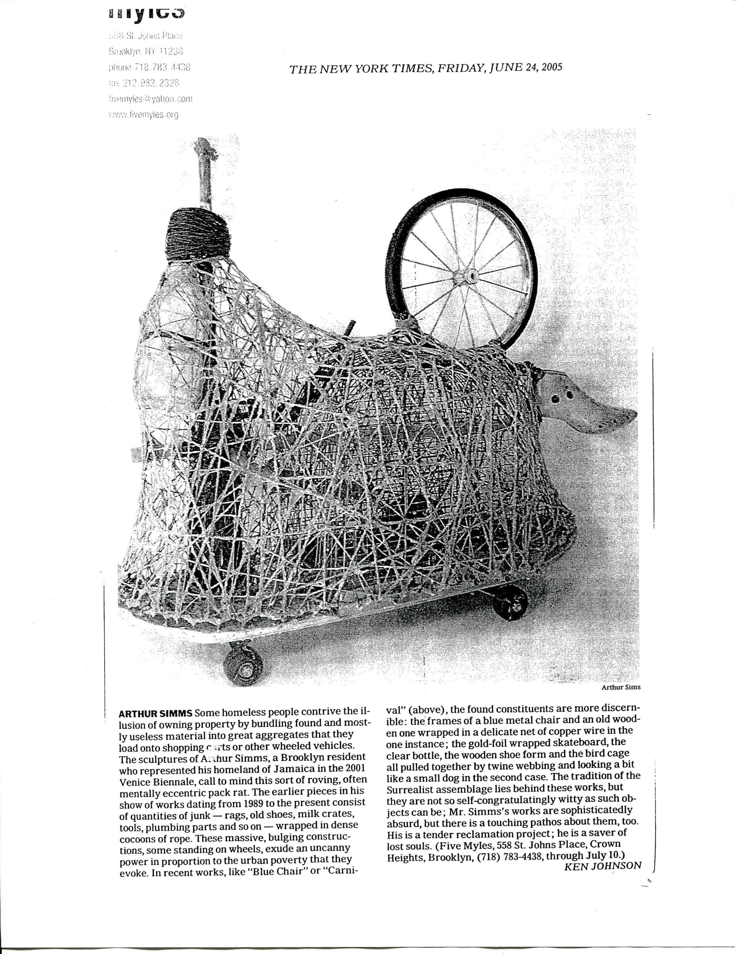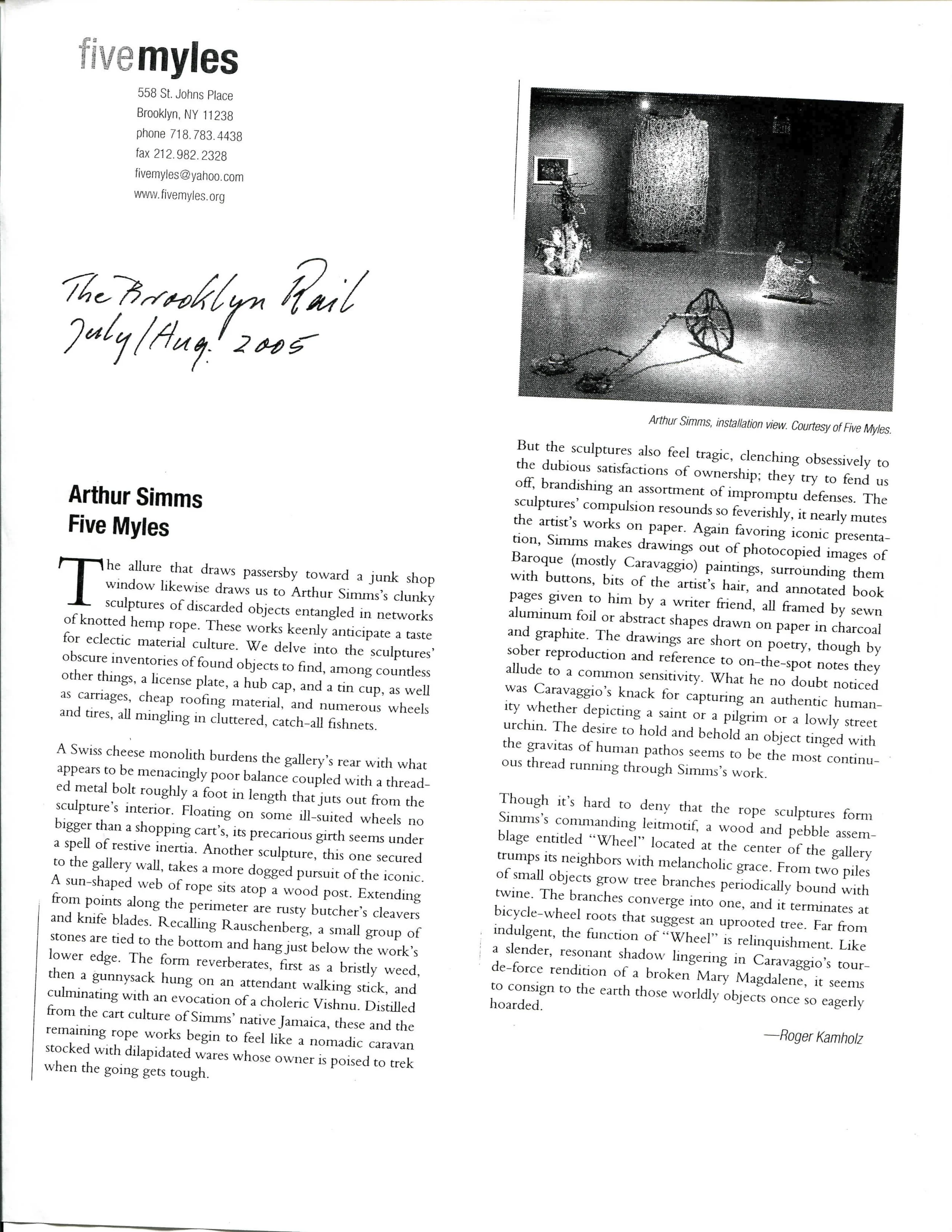 A recent recipient of the Rome Prize Fellowship, the mixed media sculptor Arthur Simms represented Jamaica in its first ever pavilion in the 49th Venice Biennial in 2001. He is known for his ability to turn found objects into dynamic sculptures that combine formal arrangements with the wit, lightheartedness and craft sensibility of the Caribbean. The sculptures are made of the detritus of the urban landscape –wood, rocks, wire, scrap metal etc. Arthur Simms’ art merges his American education with his Jamaican roots. At FiveMyles he will exhibit sculptures and rarely shown drawings that date from 1989 to 2005. Like his sculptures, Simms’ drawings are an amalgam of cross cultural dialogue.