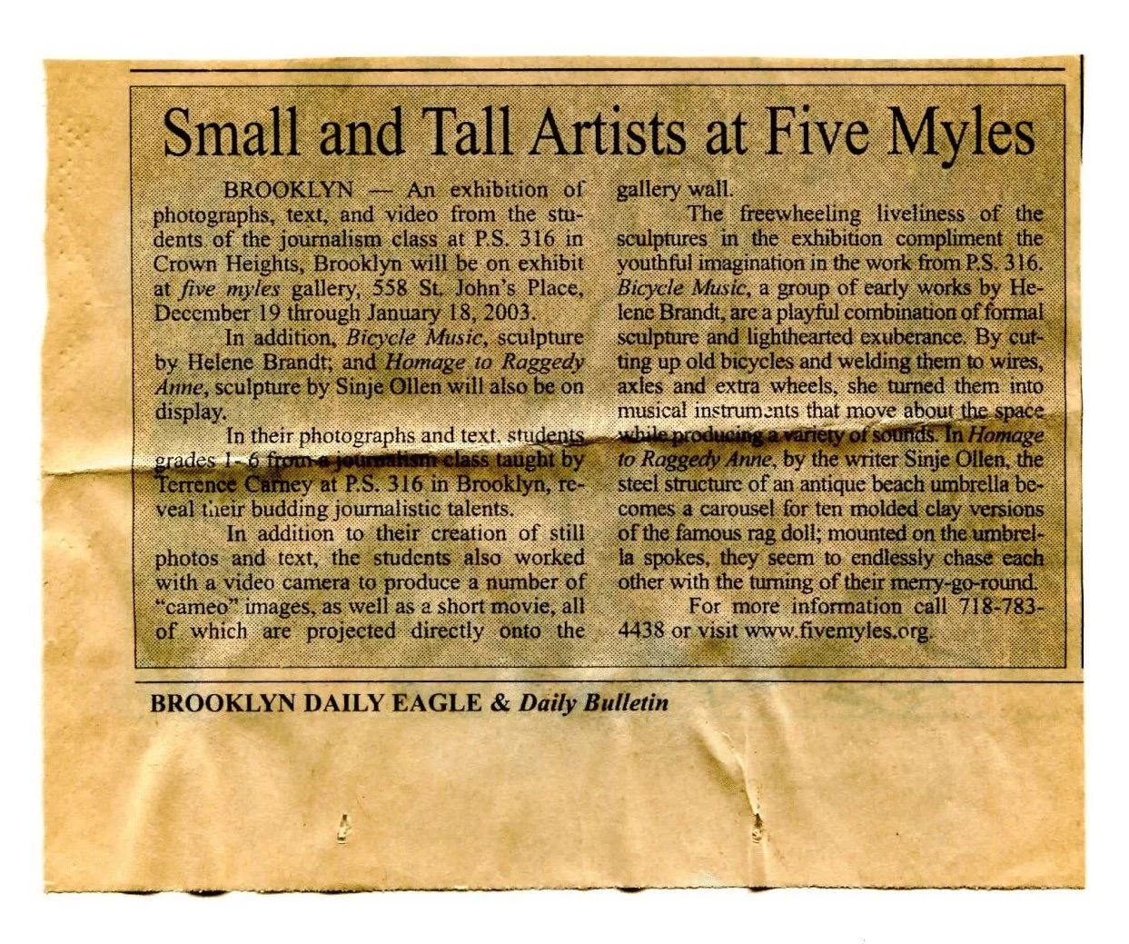 This exhibition points out the commitment of many schools in under-served areas of the city to offer excitement and stimulation to their students, as does P.S. 316 with a journalism class taught by Terrence Carney. The photographs and texts exhibited are works by students from P.S. 316 in Crown Heights, Brooklyn, grades 1 through 6. The students also worked with a video camera - the resulting images, as well as a short movie made by the students, are projected directly onto the wall.