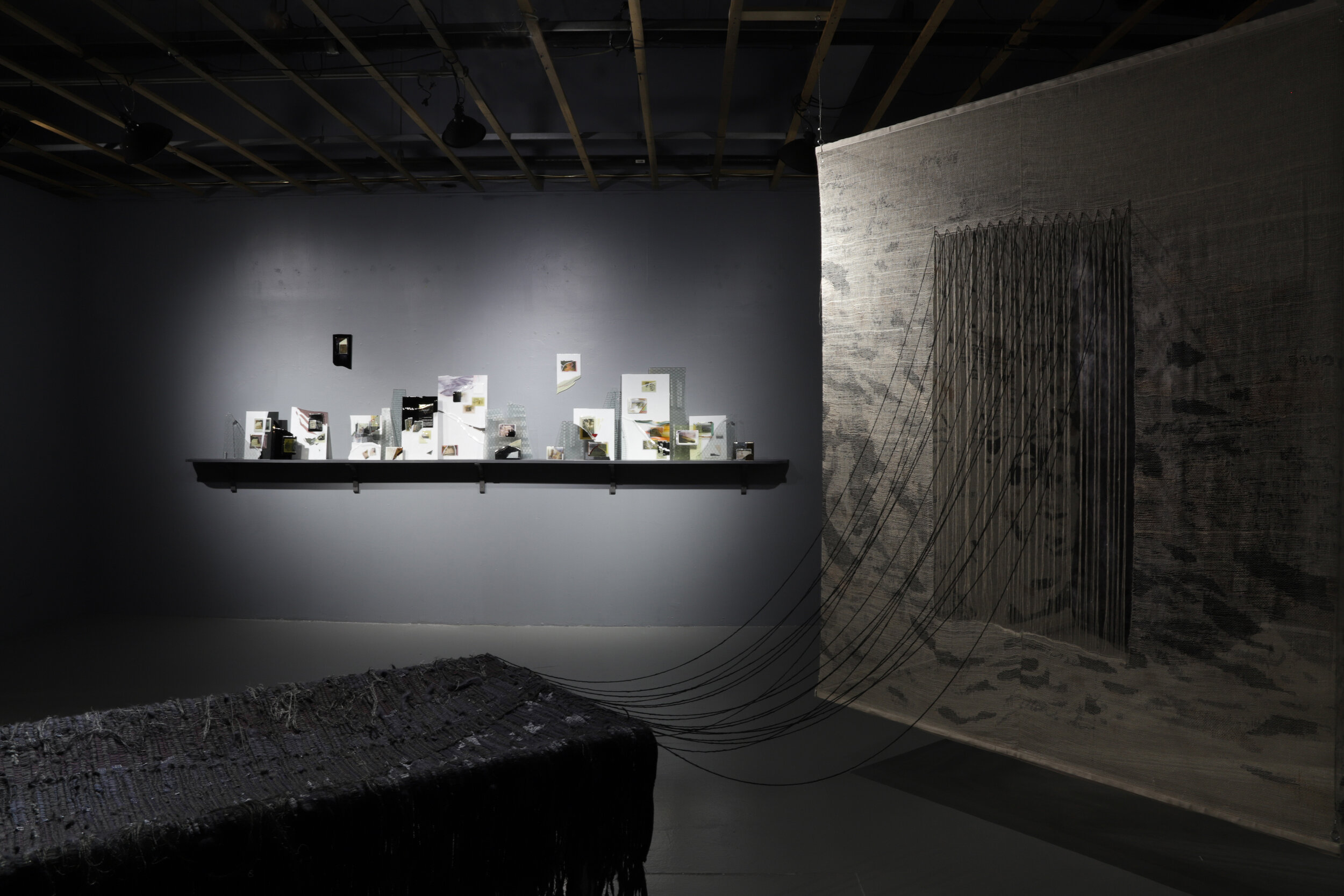 That Day, We Looked Happy is an immersive installation that envisions artistic labor as a vehicle for transforming loss that exceeds our limits. It draws from an archive of photos and documents Rowan Renee inherited after their father's death. At the center of the installation is a hand-woven enclosure built around the footprint of a 6ft x 8ft prison cell. The translucent linen and wool mesh is printed with fragments of correspondence and other documents that fade in and out of legibility. Along the walls of the gallery hangs a collection of family photos, broken and reconfigured on fused-glass.