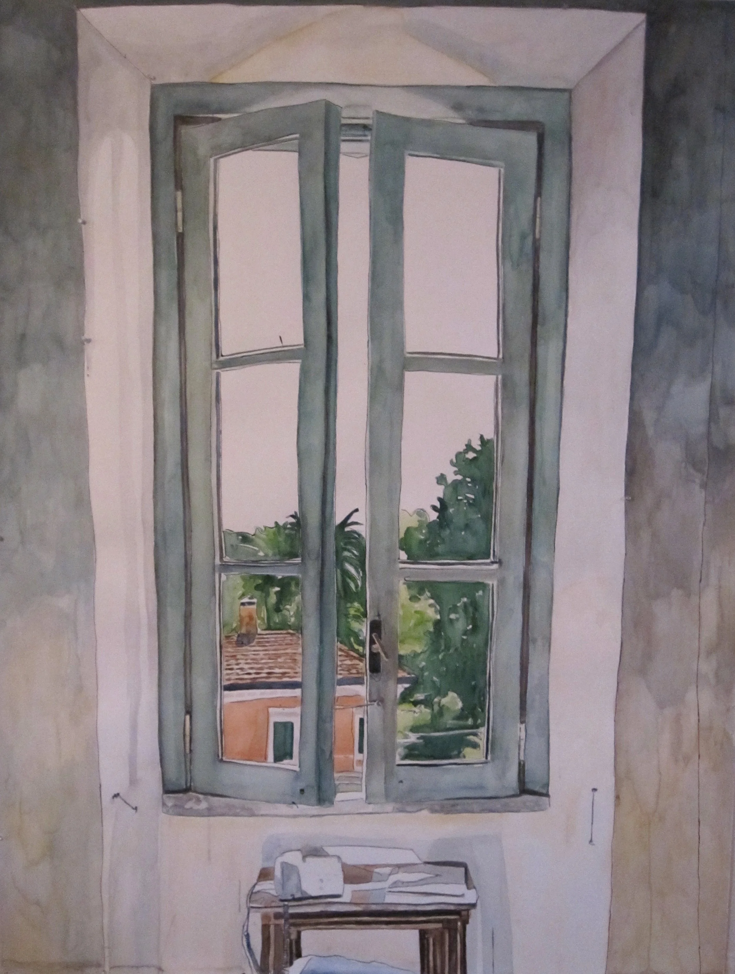 Eleanor Clark, in Rome and a Villa (Doubleday, 1952), uses the term windowphilia to describe the enchanting quality windows have in the design of a villa. My work included in The View from Here is from a body of work that is indeed my own bit of windowphilia; large paintings—part window, part interior—that reference the historical and physical attributes of the places I have visited, as well as the generations that have passed through them and my own presence as a contemporary visitor.